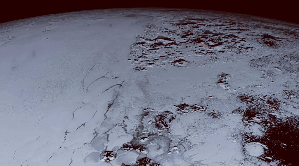 冥王星的首要恐怖,是接近绝对零度的极寒。这里平均温度低至-229℃,比地球南极最低温还要低140℃。在这种极寒下,钢铁会脆如玻璃,大气中的氮气、甲烷会凝结成蓝色冰晶,像雪花般飘落。新视野号探测器发现,其表面98%被固态氮冰覆盖,仅点缀着甲烷与一氧化碳冰层,阳光照射下泛着诡异蓝光,宛如死亡世界的幕布。这里接收的太阳辐射仅为地球的1/900,正午光照不过地球黄昏水平,永恒的昏暗更添阴森。