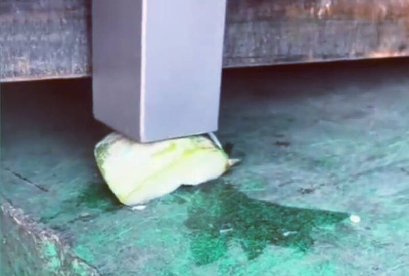 更令人叫绝的是冬瓜的“持续润滑”能力。随着机器滑行,底层瓜肉会不断磨损,但内部新鲜瓜肉会持续暴露、分泌黏液,形成动态补给的润滑体系,确保机器能平稳移动较长距离。视频中工人的操作还藏着一个关键细节:冬瓜带皮朝上放置。粗糙的瓜皮能与机器底部产生足够摩擦力,防止冬瓜相对机器滑动,而坚韧的瓜皮又能保护内部瓜肉,让润滑效果更持久。