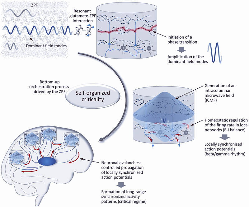 研究通过量子电动力学模型计算发现,谷氨酸分子的电偶极矩会在皮层微柱的特定几何空间中有序排列,形成相干的集体振荡模式。而这种振荡的频率,恰好能与零点场频谱中的特定模式形成共振。这一双向互动机制,成为意识产生的关键:零点场为大脑提供持续的能量支持,让神经元的有序振荡得以在热噪声中维持;同时,大脑的共振又会选择性放大零点场中的特定频率信号。