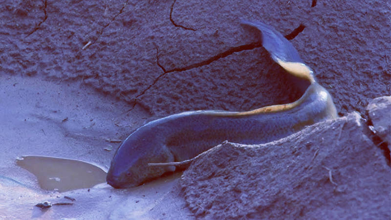 当旱季的脚步悄然临近,非洲肺鱼便会在逐渐变硬的淤泥里向下挖掘。它的鱼鳍虽无法支撑其在陆地上灵活行走,却足以助力它在淤泥中穿梭移动。它会持续向下,直到找到湿度与温度都相对稳定的理想位置。