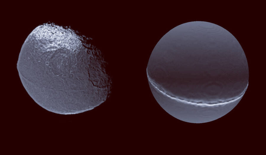 2004年,“卡西尼号”探测器近距离探测土卫八,又发现了新的奇迹:其赤道区域有一条巨大隆起带,平均宽20公里、高13公里,沿赤道延伸约1300公里。而土卫八直径仅1470公里,这条隆起带宛如巨型焊枪留下的痕迹,让这颗卫星更添神秘色彩,甚至有人猜测它是外星文明遗留的废弃飞船。