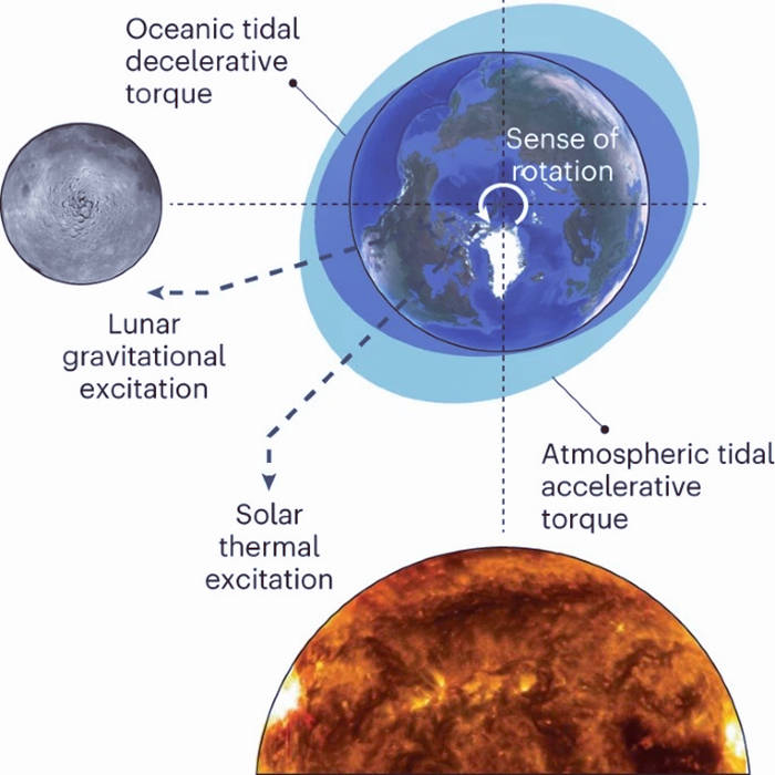 真正打破单调趋势、锁定 19 小时一天的,是太阳驱动的大气潮汐。阳光加热地球高层大气,形成周期性压力波,如同给地球自转 “踩油门”。在多数时期,这种加速作用远弱于月球的制动效应,但在 20 亿至 10 亿年前,地球进入了罕见的潮汐共振状态。当时大气温度与成分恰到好处,大气潮汐的波动周期与地球自转周期形成整数倍共振,加速效应被成倍放大。