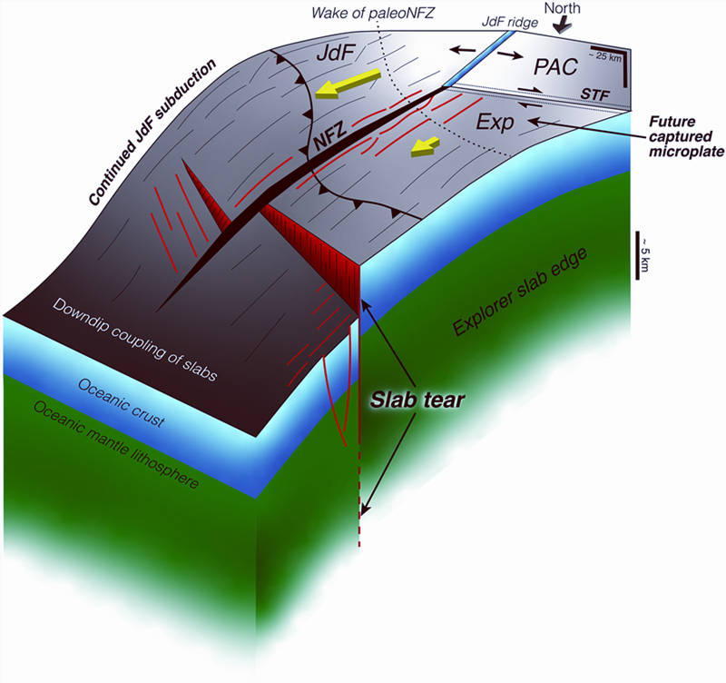 据悉,胡安·德富卡板块与探险者板块原本同属一个整体,均起源于西侧的大洋中脊——那里是地幔物质涌出、冷却凝固形成新地壳的地方。随着地幔物质持续喷发,新地壳不断向两侧扩张,推动着板块缓慢移动。但由于探险者板块所处区域更靠近大洋中脊,岩石温度更高、密度更小,难以像胡安·德富卡板块那样顺利向北美板块之下俯冲,最终导致其俯冲运动停滞,而周边板块的持续运动则不断拉扯地壳,久而久之便撕裂出这条巨大的裂缝。