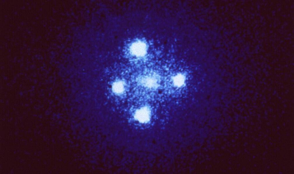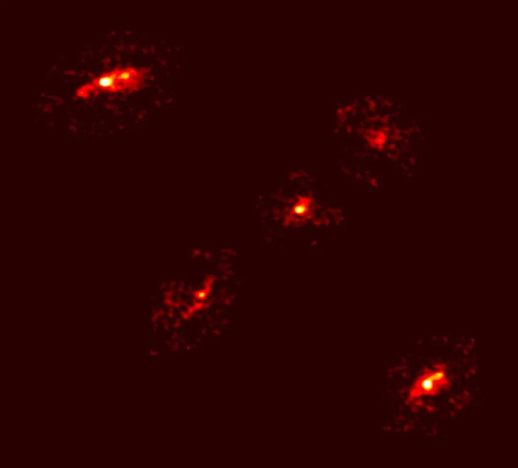 当科学家用阿尔卑斯山的NOEMA阵列与阿塔卡马的ALMA阵列,对准117亿光年外的一小块天区时,所有人都惊呆了:屏幕上赫然出现五个一模一样的星系,亮度、颜色、形状完美重合,还规整地排成十字,中间甚至有一个清晰的中心像,仿佛有人在宇宙中按下了复制粘贴键,让人不禁怀疑:宇宙是不是出bug了?