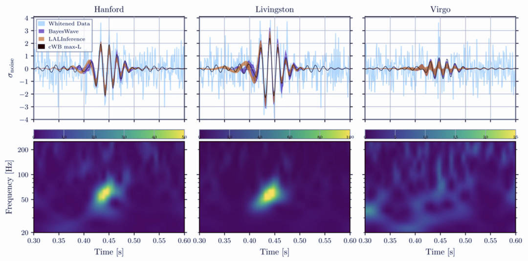 这段被命名为GW190521的神秘信号,最早于2019年被LIGO和VIRGO引力波探测器共同记录,却在近期中国科研团队的复盘分析中展现出非同寻常的特质。与常规黑洞合并产生的“啁啾”信号不同,它持续时间不足0.1秒,峰值频率约30赫兹,没有黑洞合并应有的旋近阶段,仅以一声突兀的脉冲出现后便归于沉寂,宛如宇宙深处传来的一声“叹息”。