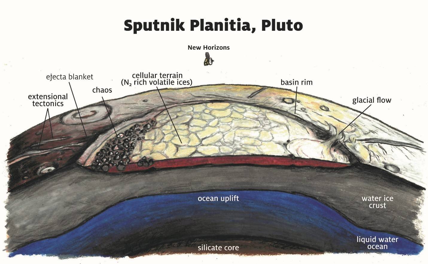 科学家推断,冥王星拥有炽热内核,核心中的钾、铀、钍等放射性元素持续衰变放热,为地质活动提供动力。这种稳定的内热,足以让冰壳之下保持液态水。结合引力与地形数据的计算机建模显示,冥王星冰层下方,极可能存在一片全球性液态水海洋。液态水是生命赖以生存的基础,这一发现让冥王星具备了孕育生命的首要条件。