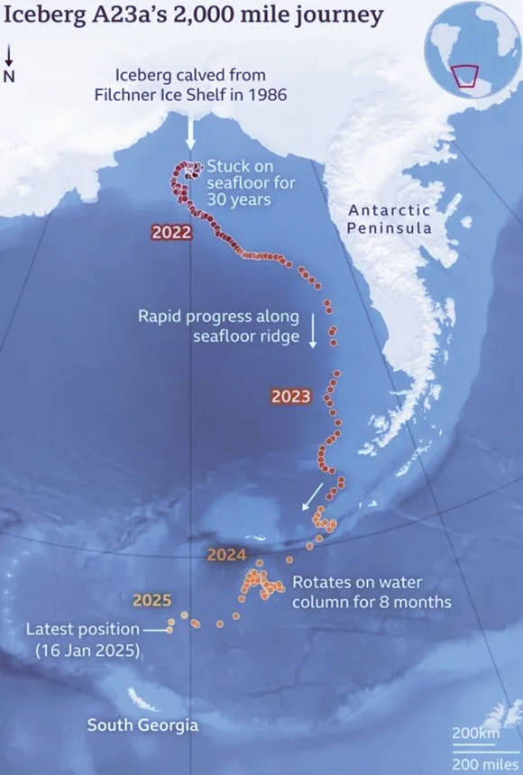 A23a的生命历程始于1986年,它从南极菲尔希纳冰架断裂后,因底部搁浅在威德尔海,开启了长达34年的“静止生涯”。巅峰时期,它的面积接近4000平方公里,相当于三个纽约市大小,厚度超280米,1万亿吨的重量堪比全球所有淡水湖储量的总和,凭借庞大体量长期稳居世界最大冰山宝座。2020年,随着底部冰层被暖水侵蚀,它挣脱海床束缚,开启北漂之旅,也一步步走向消亡。